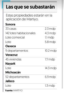 Las 9 propiedades a subastarse tienen precios de salida desde un millón 118 mil pesos hasta 14 millones 316 mil pesos, entre estos están haciendas, terrenos, casas y lotes de vivienda social, edificio de departamentos.